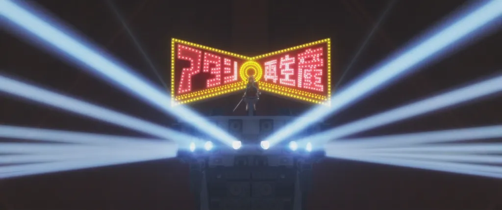 到这里就是本作另一个高明之处,在塑造故事角色的过程中,我们多数时候需要看到角色的成长性,这种成长性让观众获得了参与感与满足感。而成长过程的塑造一直是考验创作者的难点,过于唯心、抑或突兀、或是时间混乱都会导致角色成长性的塑造失败,进而影响整个角色的塑造。哪怕是去年上映的让无数人「告别青春」的名监督作品,也因为角色的成长让人感觉过于说教而使很多人不能接受3。而「再生产」巧妙的通过角色本身的一次次重构来达成成长,并将其于故事的舞台有机结合,无论是红底巨字的「アタシ再生産」,还是激情快节奏的制衣厂变装兼用卡、亦或是不断打开的夺目灯光牌,巨量的信息冲击让观众必须迅速接受巨大信息量,对角色「自满 -> 受挫 -> 崩解 -> 进步 -> 重构」这一角色成长进化路线迅速接受。