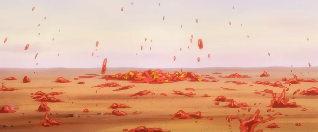 剧场版开幕的 Revue 是 banana 的「斩尽杀绝 Revue」,配曲名则是 wi(l)d-screen baroque。如果把括号中的字母直接去掉来念就形成了音似 wide-screen baroque(ワイドスクリーンバロック)的存在。这一脱胎于太空歌剧的概念,在流入日本时含义发生了转变,更强调于「大量概念的堆砌」2,恰恰印证了本篇大量的符号涌入 —— 电车、T形棺、天堂的鸟、灯光牌、星星纽扣、制衣厂、无论是TV光在的沙漠还是剧场版华恋所在沙漠都存在的大量重复符号素材等等。这些符号的涌入,在本来相对简练的画面上迅速为观众扩充了巨量的想象空间,同时以视觉冲击来推动观众对剧情的感受。而在少歌中,我们同样可以找到保留的 wide-screen baroque 原初定义中,夸张的演出效果和大场面。