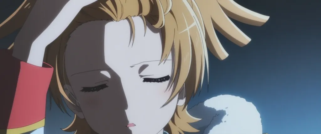 至此,古川达成了「语言」的构建,这样的语言,达成了「让画面讲故事」——不需要庞杂的文字抑或旁白,灯光、舞台、布景、歌曲、唱法、打斗在共同表现故事剧情,而不是仅仅为角色对白所服务。同时舞台夸张的「表现主义」让其得以脱离「现实主义」的束缚,时间可以被无限延展与压缩,这样便让而画面的编排与安插有了空间,也就是被称作分镜或者演出的部分,共同让画面与剧情变得势如洪水般湍流涌动地向前推进。而谈到少歌的画面,离不开的则是其灯光的运用 —— 不同于一般类似番剧中全片大量泛滥的暖色光与柔光,本片的 Revue 场景运用了大量冷色光与硬光来切割画面——正如现实舞台上的聚光灯,从而将角色从抽象化和色彩化的背景舞台中分离出来,与此同时,角色登台时筒灯的运动逻辑以及最后的灯光方向都在一定程度上辅助了角色初印象的「立」。从这个角度来说,《少女☆歌剧》是一部很动画的动画,充分利用动画的抽象化与夸张化,并以画面性来取代了文字性。